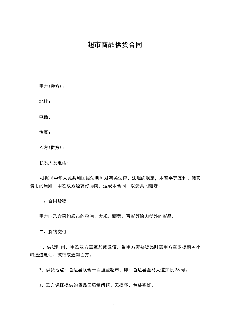 2、供货地点:色达县联合一百加盟超市,即:色达县金马大道东段36号。
