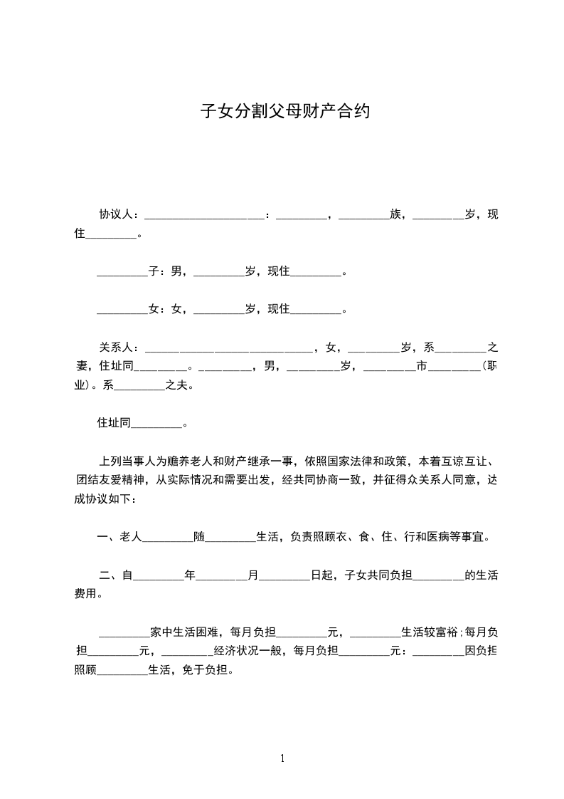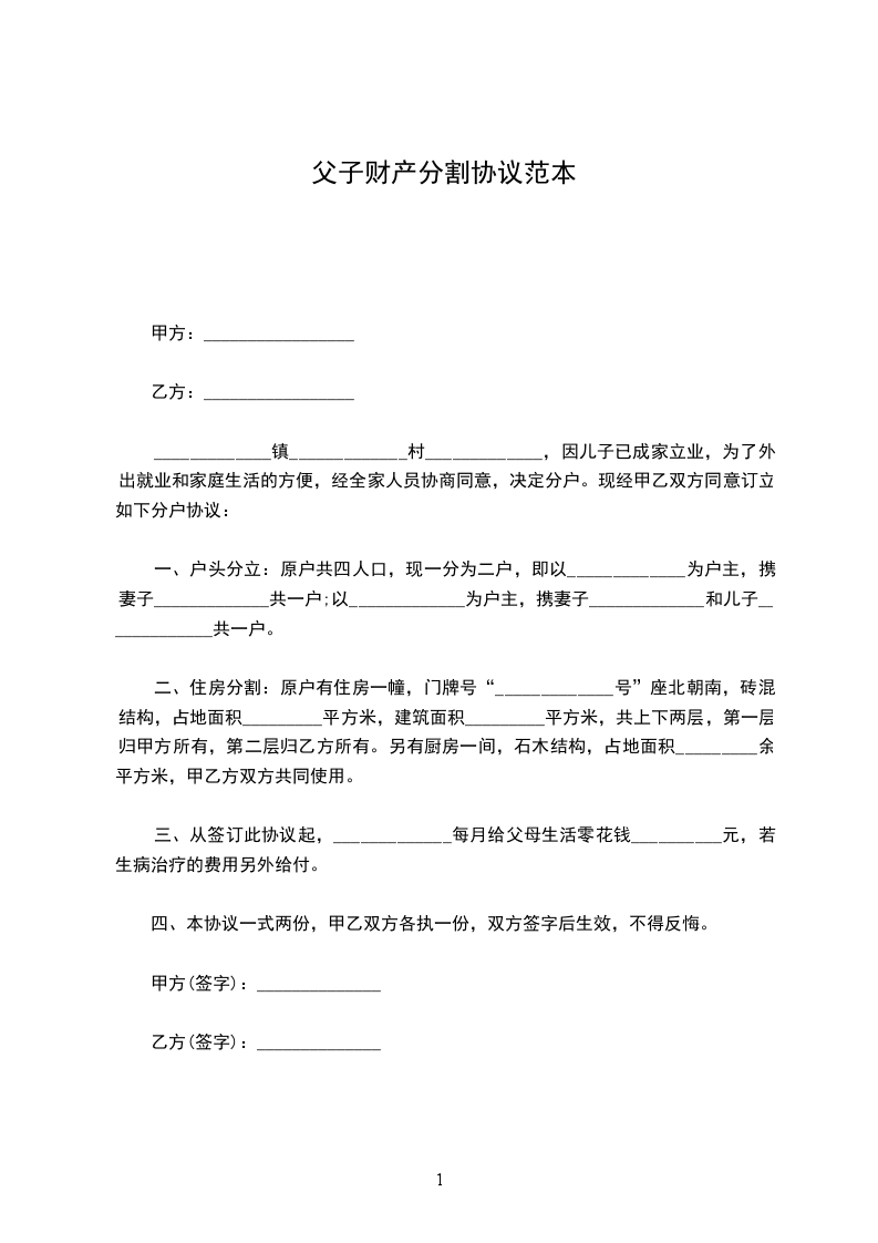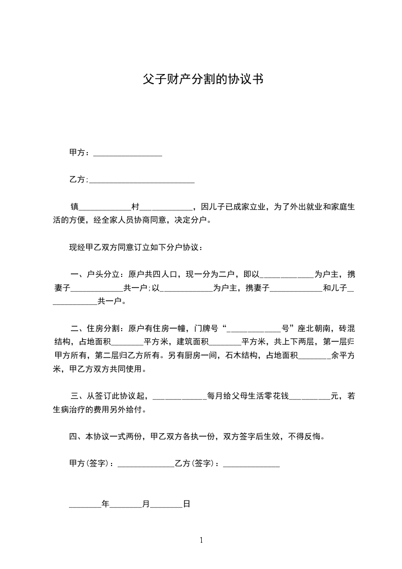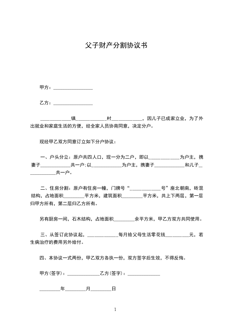 一、户头分立:原户共四人口,现一分为二户,即以_____________为户主,携妻子_____________共一户;以_____________为户主,携妻子_____________和儿子_____________共一户。