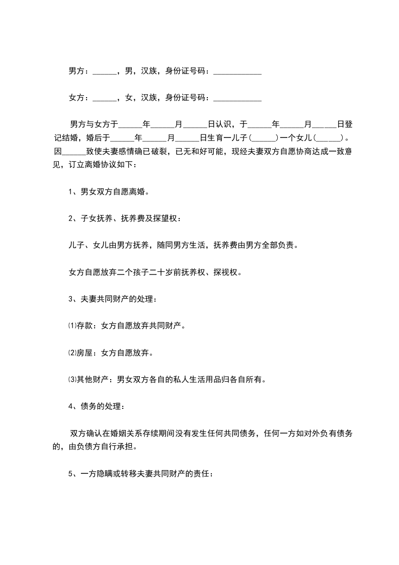男方与女方于______年______月______日认识,于______年______月______日登记结婚,婚后于______年______月______日生育一儿子(______)一个女儿(______)。因______致使夫妻感情确已破裂,已无和好可能,现经夫妻双方自愿协商达成一致意见,订立离婚协议如下: