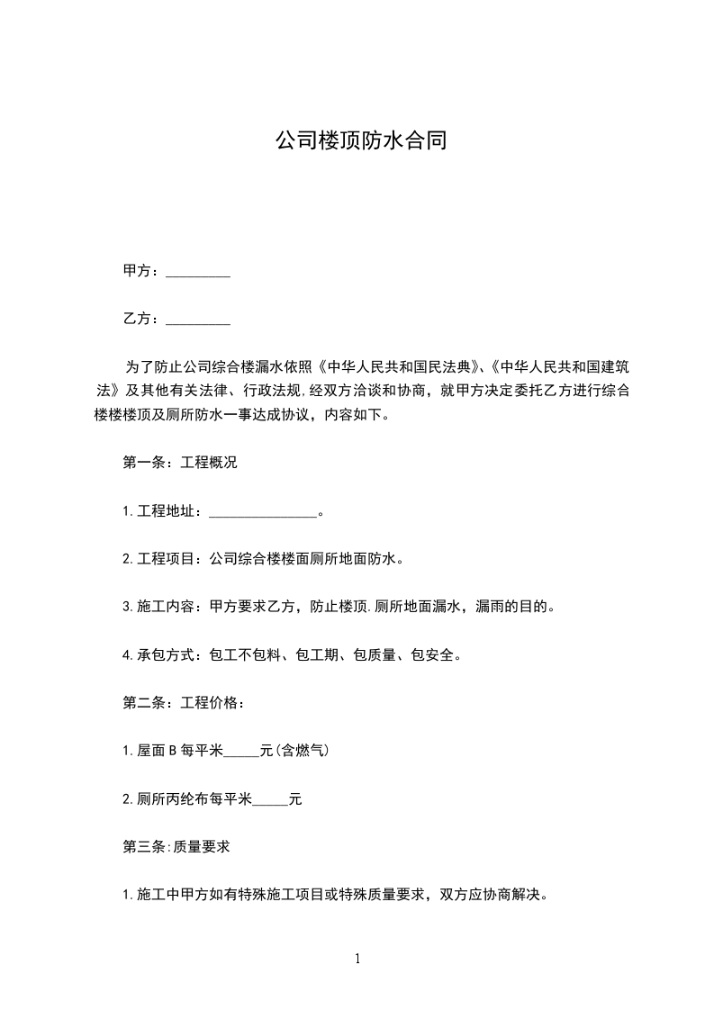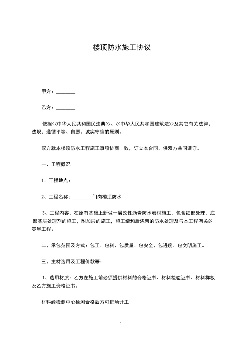 根据《中华人民共和国民法典》及相关法律法规的规定,甲乙双方在平等、自愿、公平、诚实信用的基础上,就甲方楼顶防水工程承包事宜达成如下协议: