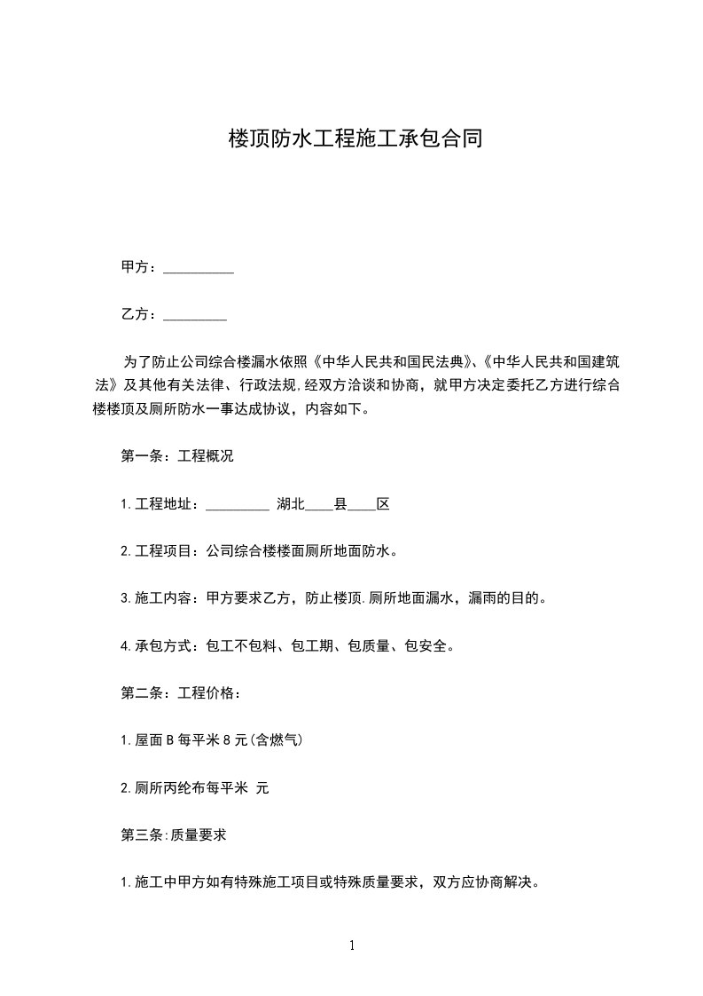 2. 工程内容:对甲方楼顶进行防水施工,包括但不限于清理楼顶基层、涂刷防水材料、铺设防水卷材等,确保楼顶防水效果达到国家相关标准及行业规范要求。