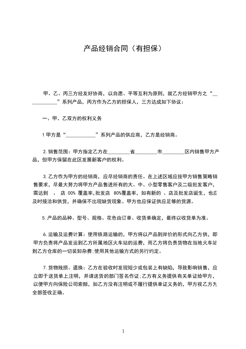 甲、乙、丙三方经友好协商,以自愿、平等互利为原则,就乙方经销甲方之“__________”系列产品,丙方作为乙方的担保人,三方达成如下协议: