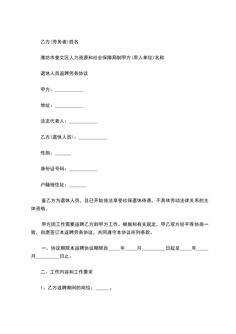 兹有_______因_______需要,聘用_______的退休人员_______同志,现经协商一致,特签订本合同,以共同遵守执行。