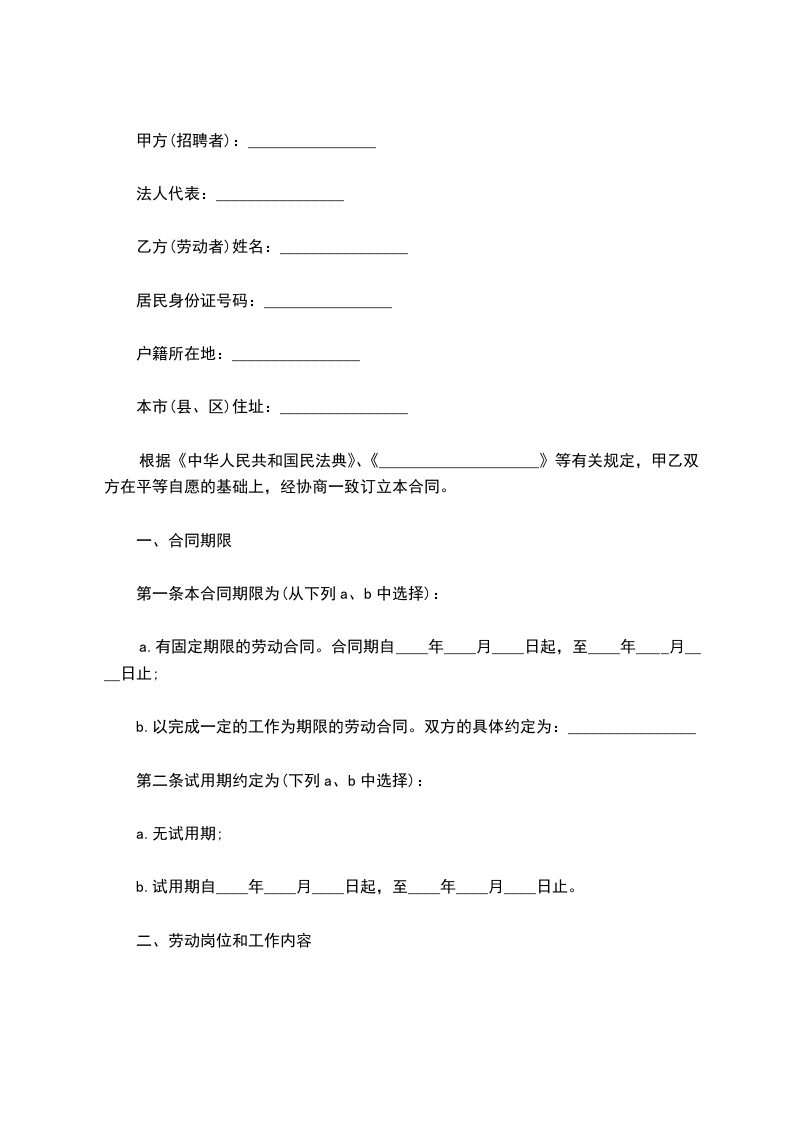 第一条 本合同期限为(从下列a、b中选择)