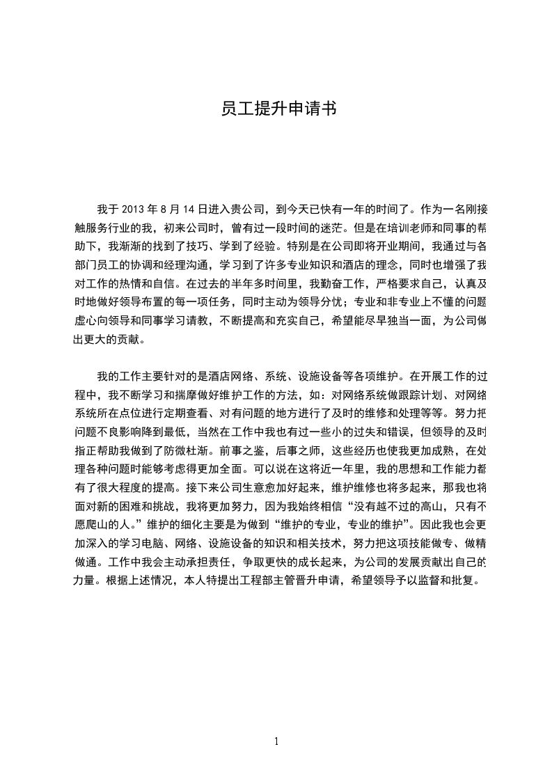 我的工作主要针对的是酒店网络、系统、设施设备等各项维护。在开展工作的过程中,我不断学习和揣摩做好维护工作的方法,如:对网络系统做跟踪计划、对网络系统所在点位进行定期查看、对有问题的地方进行了及时的维修和处理等等。努力把问题不良影响降到最低,当然在工作中我也有过一些小的过失和错误,但领导的及时指正帮助我做到了防微杜渐。前事之鉴,后事之师,这些经历也使我更加成熟,在处理各种问题时能够考虑得更加全面。可以说在这将近一年里,我的思想和工作能力都有了很大程度的提高。接下来公司生意愈加好起来,维护维修也将多起来,那我也将面对新的困难和挑战,我将更加努力,因为我始终相信“没有越不过的高山,只有不愿爬山的人。”维护的细化主要是为做到“维护的专业,专业的维护”。因此我也会更加深入的学习电脑、网络、设施设备的知识和相关技术,努力把这项技能做专、做精、做通。工作中我会主动承担责任,争取更快的成长起来,为公司的发展贡献出自己的力量。根据上述情况,本人特提出工程部主管晋升申请,希望领导予以监督和批复。