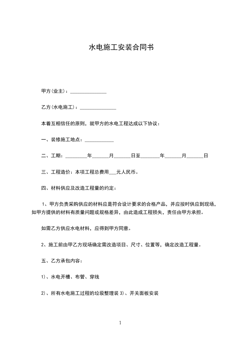 篇1 水电安装施工协议书