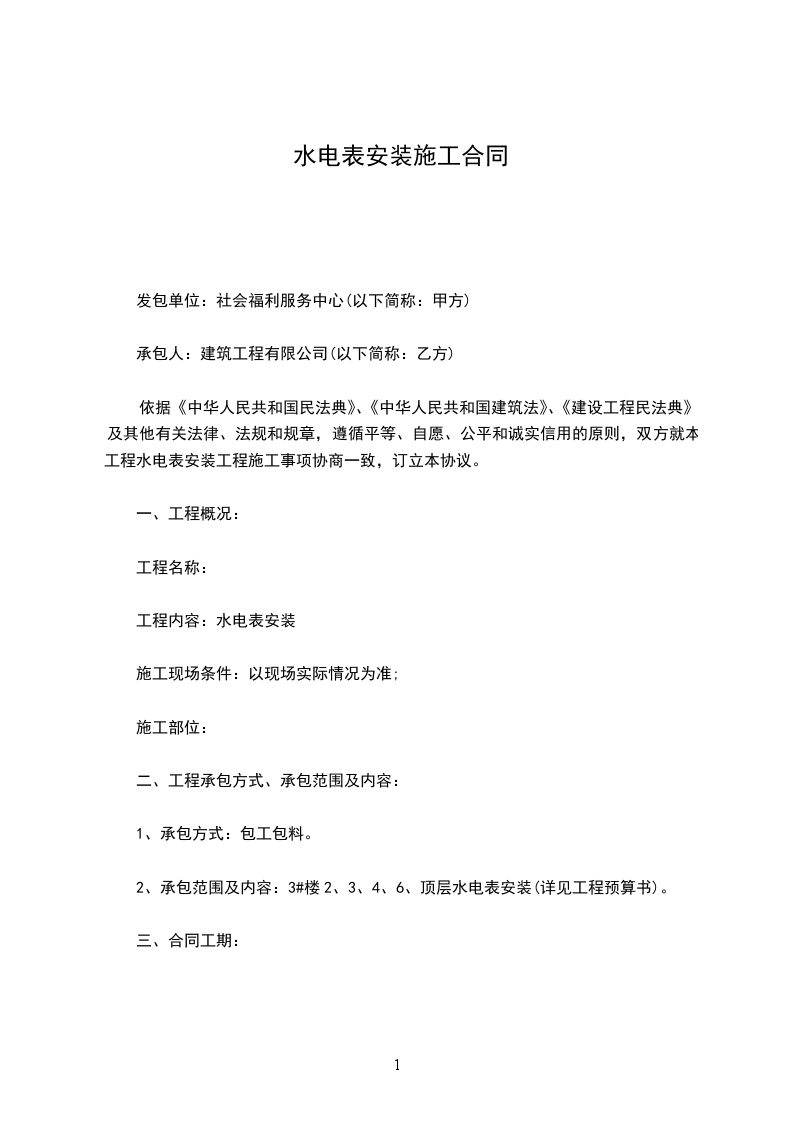 根据《中华人民共和国民法典》及相关法律法规的规定,甲乙双方在平等、自愿、公平、诚实信用的基础上,就乙方承包甲方[具体项目名称]的水电安装工程事宜,经友好协商,达成如下协议: