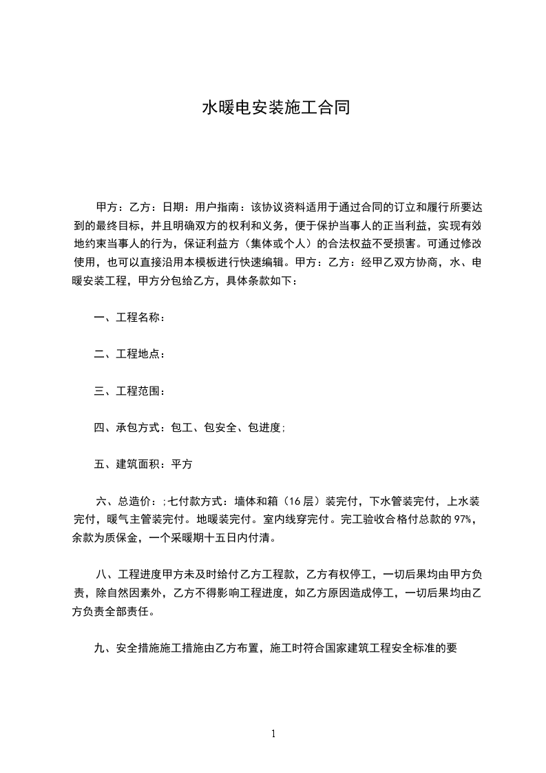 - 工程进度款:乙方完成水电安装工程总量的______%后,经甲方验收合格,甲方向乙方支付合同总价的______%,即人民币______元(大写:______元整)。
