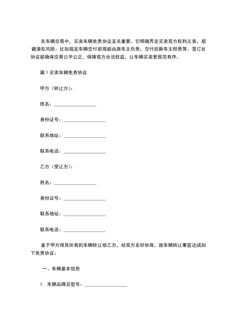鉴于甲方将自有车辆出售给乙方,为明确双方权利义务,经友好协商,甲乙双方就车辆买卖事宜达成如下免责协议: