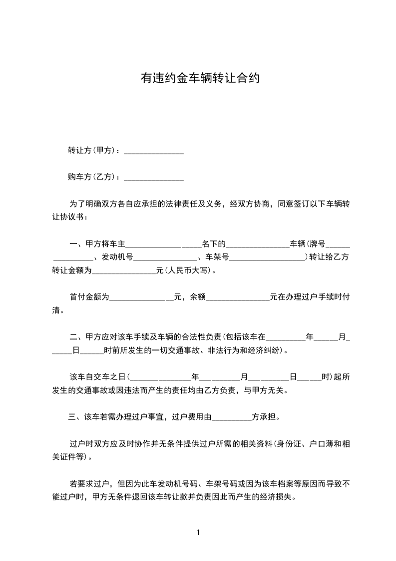 一、甲方将车主___________________名下的________________车辆(牌号________________、发动机号________________、车架号___________________)转让给乙方,转让金额为________________元(人民币大写)。