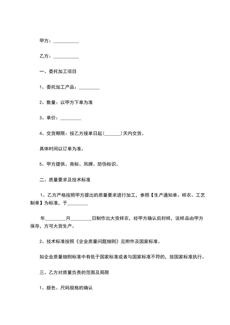 1、乙方严格按照甲方提出的质量要求进行加工,参照【生产通知单、样衣、工艺制单】为标准,于_________年_________月_________日制作出大货样衣,经甲方确认后封样,该样品由甲方保存,方可大货生产。
