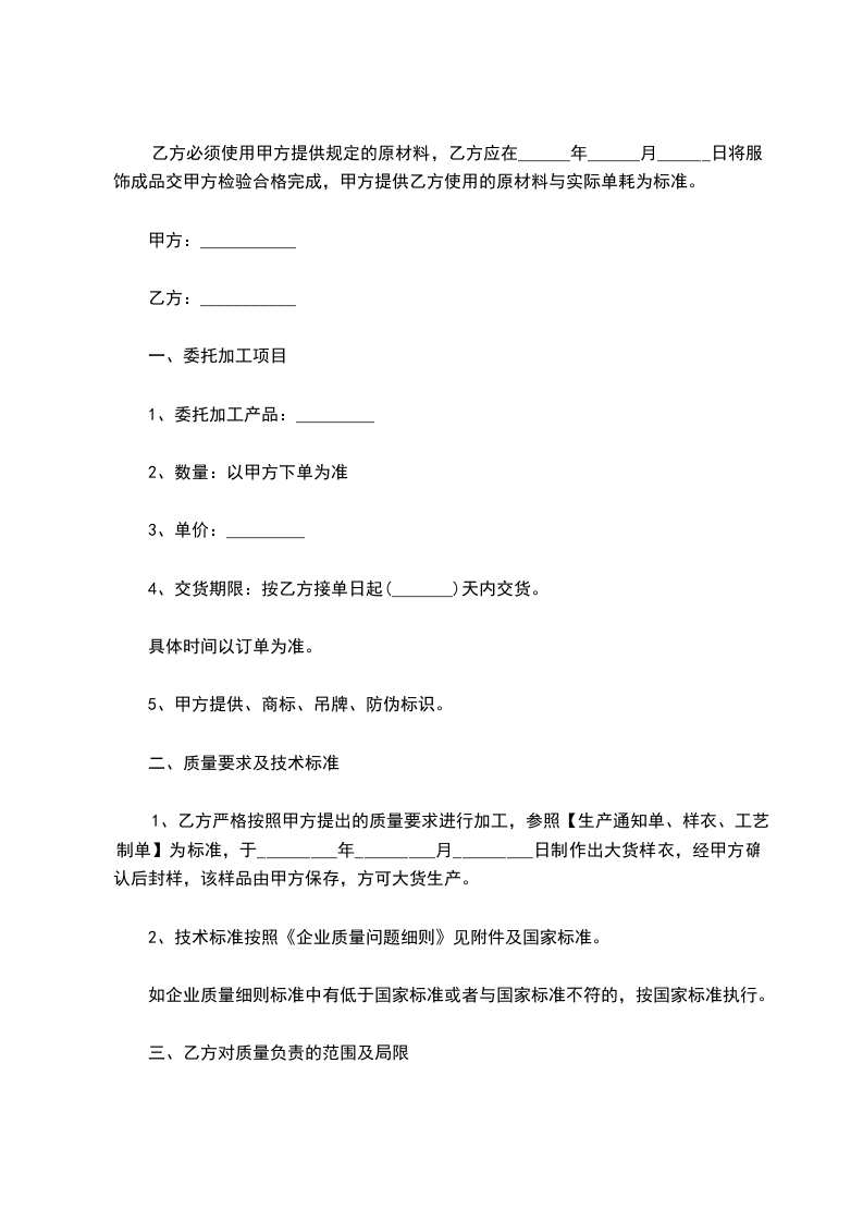 乙方必须使用甲方提供规定的原材料,乙方应在______年______月______日将服饰成品交甲方检验合格完成,甲方提供乙方使用的原材料与实际单耗为标准。