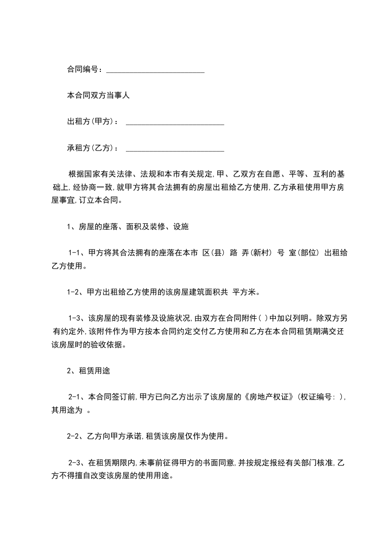 根据国家有关法律、法规和本市有关规定,甲、乙双方在自愿、平等、互利的基础上,经协商一致,就甲方将其合法拥有的房屋出租给乙方使用,乙方承租使用甲方房屋事宜,订立本合同。