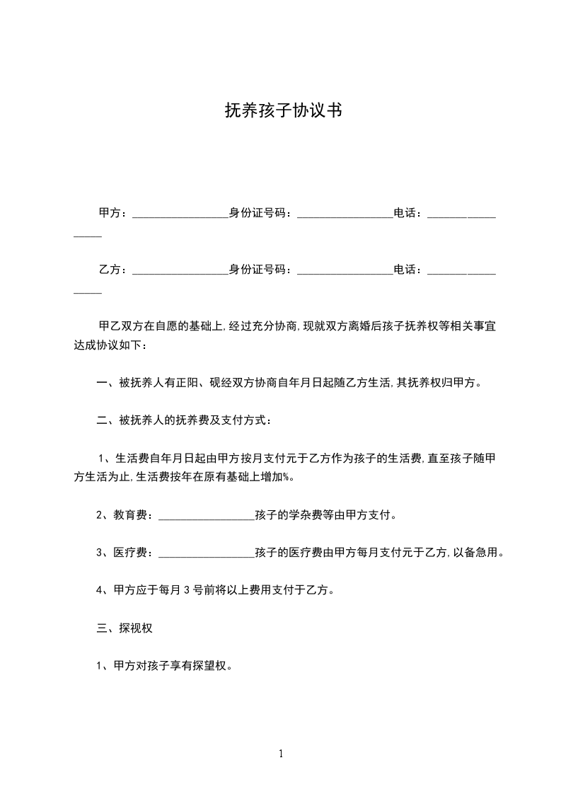一、被扶养人,现经双方协商同意自_____________年______月______日起,被抚养人随乙方生活,其抚养权归乙方。