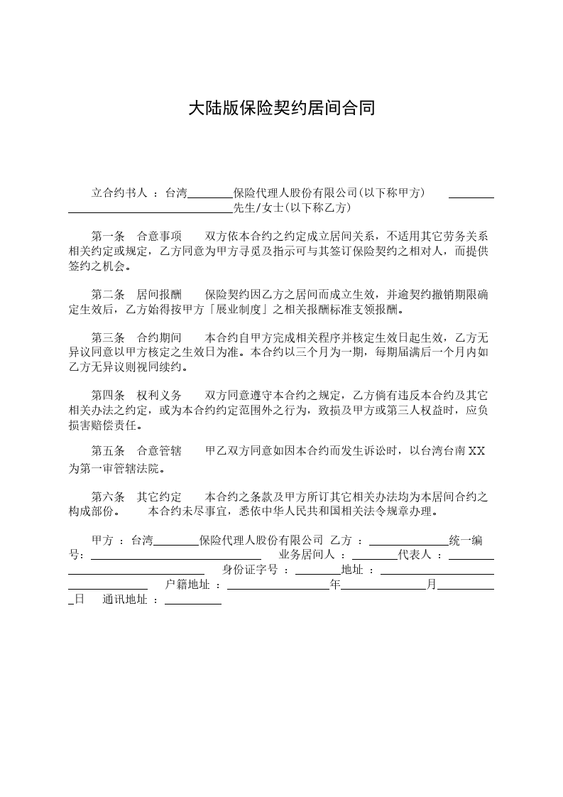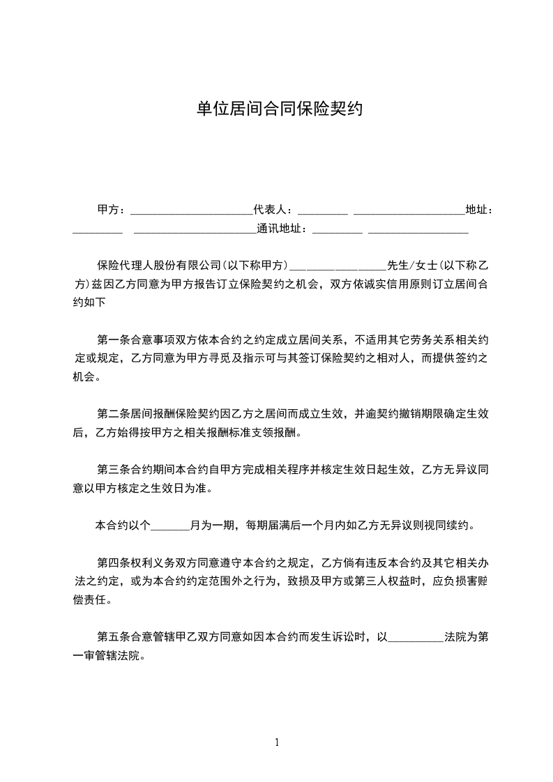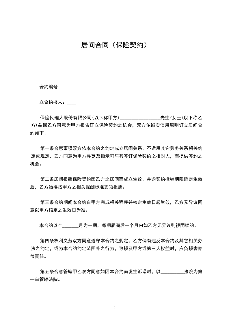 保险代理人股份有限公司(以下称甲方)_________________先生/女士(以下称乙方)兹因乙方同意为甲方报告订立保险契约之机会,双方依诚实信用原则订立居间合约如下: