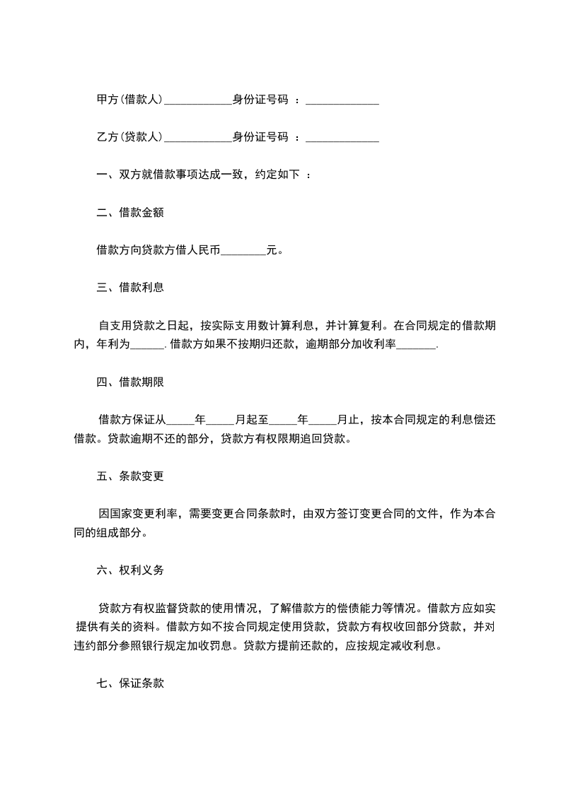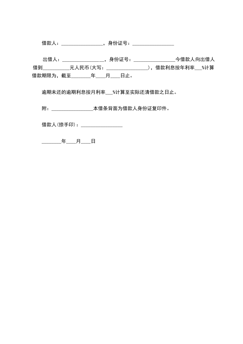 出借人:_________________,身份证号:_________________今借款人向出借人借到___________元人民币(大写:_________________),借款利息按年利率___%计算,借款期限为,截至________年____月____日止。