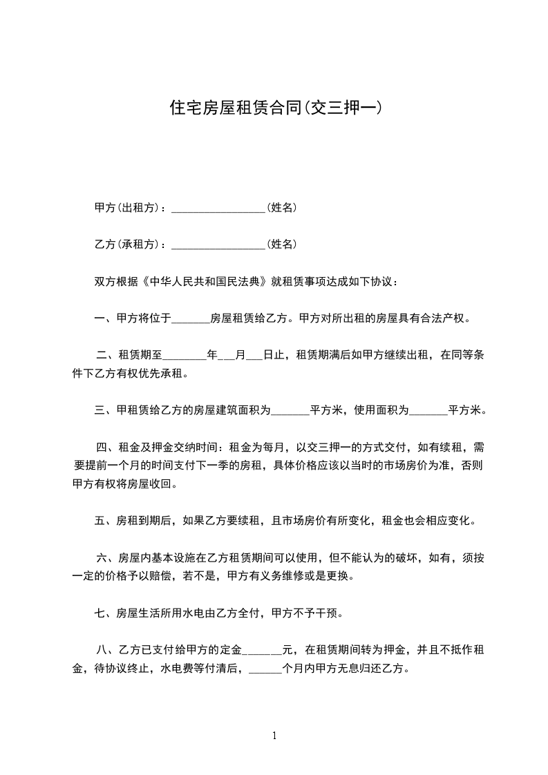 篇5押一付三住宅房租赁合同