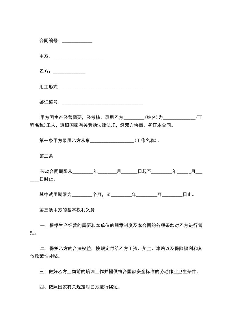 甲方因生产经营需要,经考核,录用乙方_________(姓名)为______________(工程名称)工人,遵照国家有关劳动法律法规,经双方协商,签订本合同。