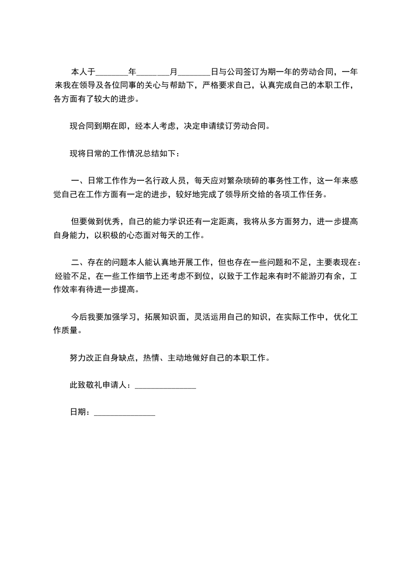 本人于________年________月________日与公司签订为期一年的劳动合同,一年来我在领导及各位同事的关心与帮助下,严格要求自己,认真完成自己的本职工作,各方面有了较大的进步。