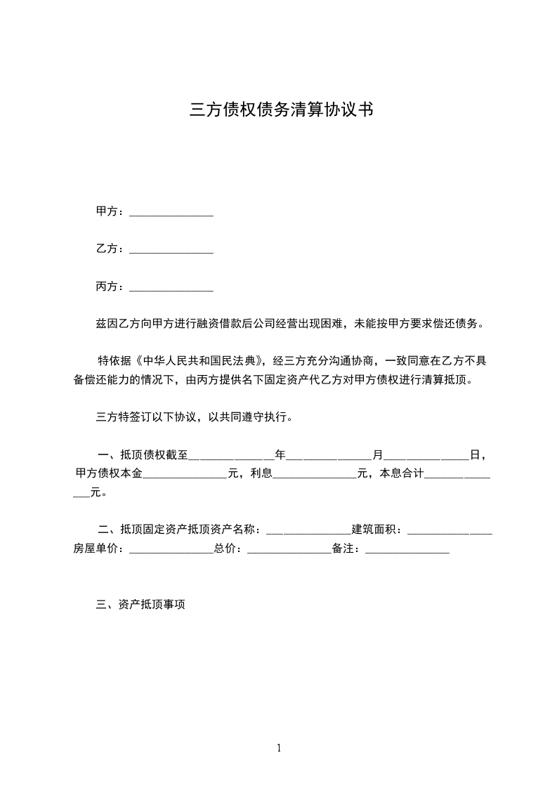 特依据《中华人民共和国民法典》,经三方充分沟通协商,一致同意在乙方不具备偿还能力的情况下,由丙方提供名下固定资产代乙方对甲方债权进行清算抵顶。