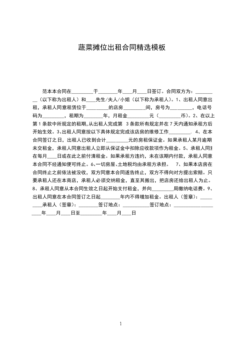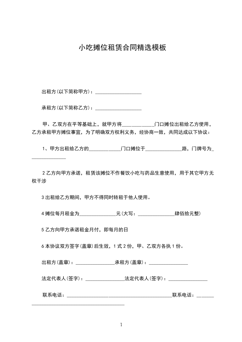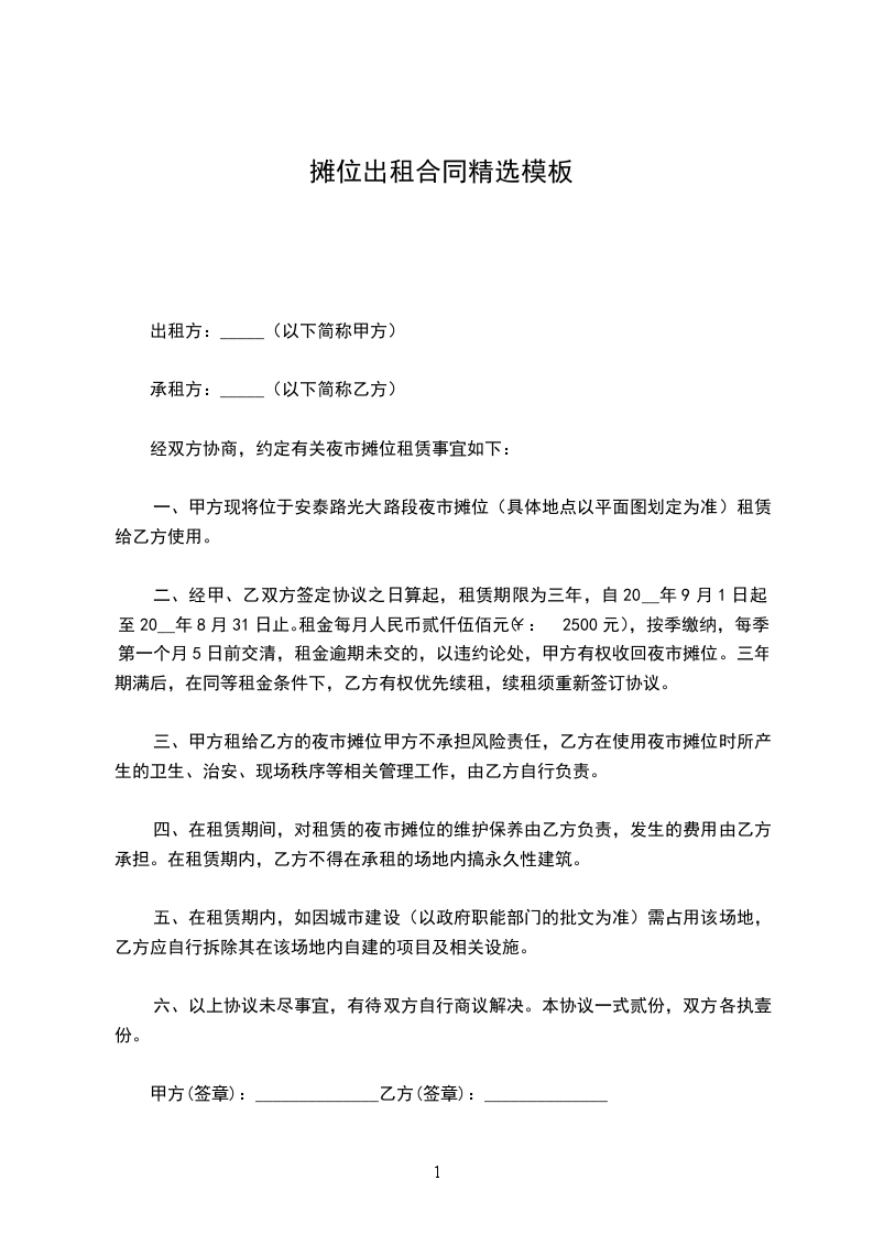 1. 该摊位租金为每月人民币______元(大写______元整)。租金总计人民币______元(大写______元整)。