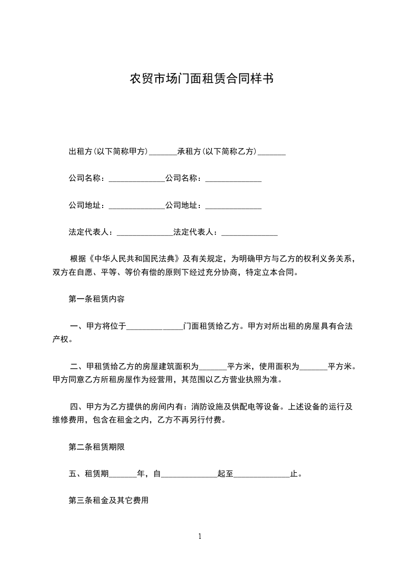 根据《中华人民共和国民法典》及相关法律法规的规定,甲乙双方在平等、自愿、公平、诚实信用的基础上,就乙方租赁甲方农村门面事宜达成如下协议: