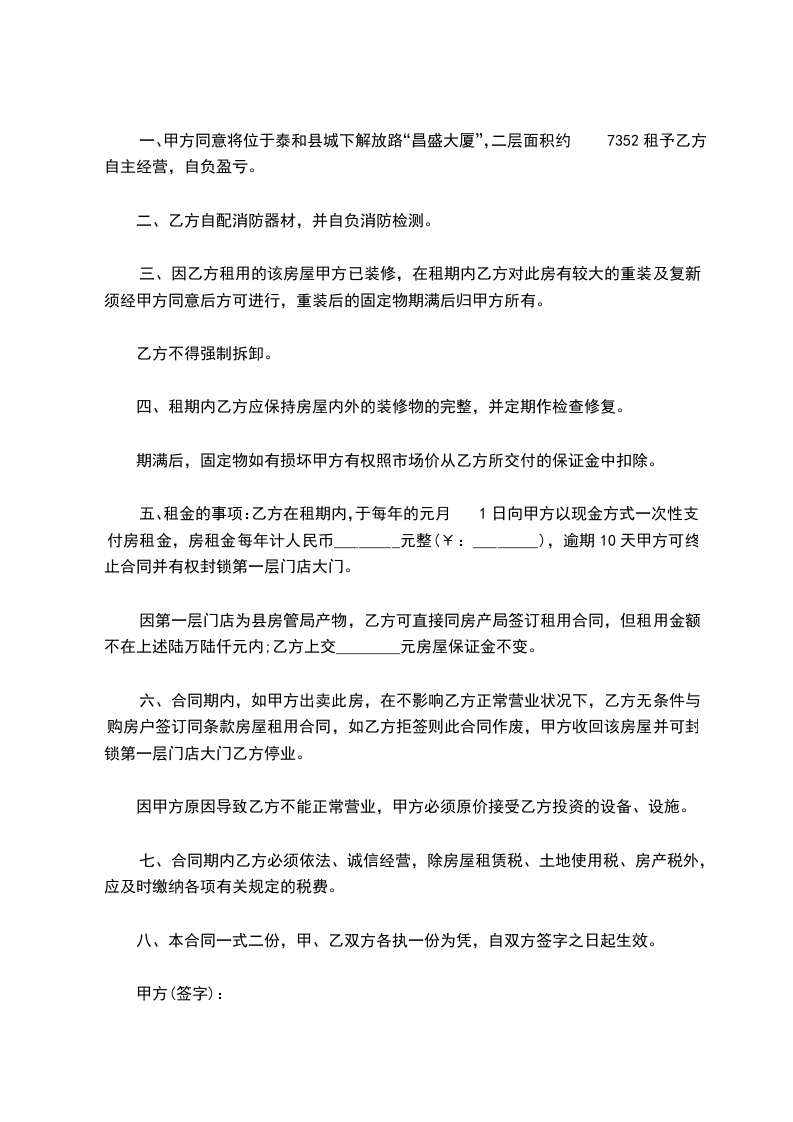 一、甲方同意将位于泰和县城下解放路“昌盛大厦”,二层面积约7352租予乙方自主经营,自负盈亏。