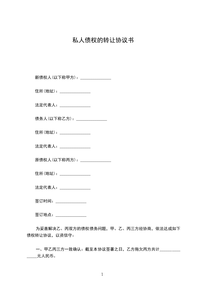 二、甲乙丙三方一致同意,丙方将针对乙方的债权共计元人民币全部转让给甲方行使,乙方按照本协议直接付款给甲方,由乙方于________年________月________日前向甲方支付共计元人民币。