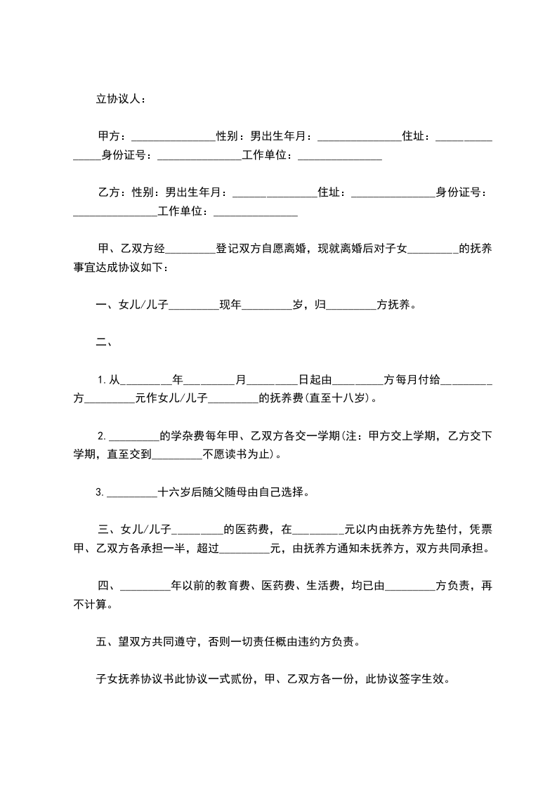 子女抚养协议书此协议一式贰份,甲、乙双方各一份,此协议签字生效。
