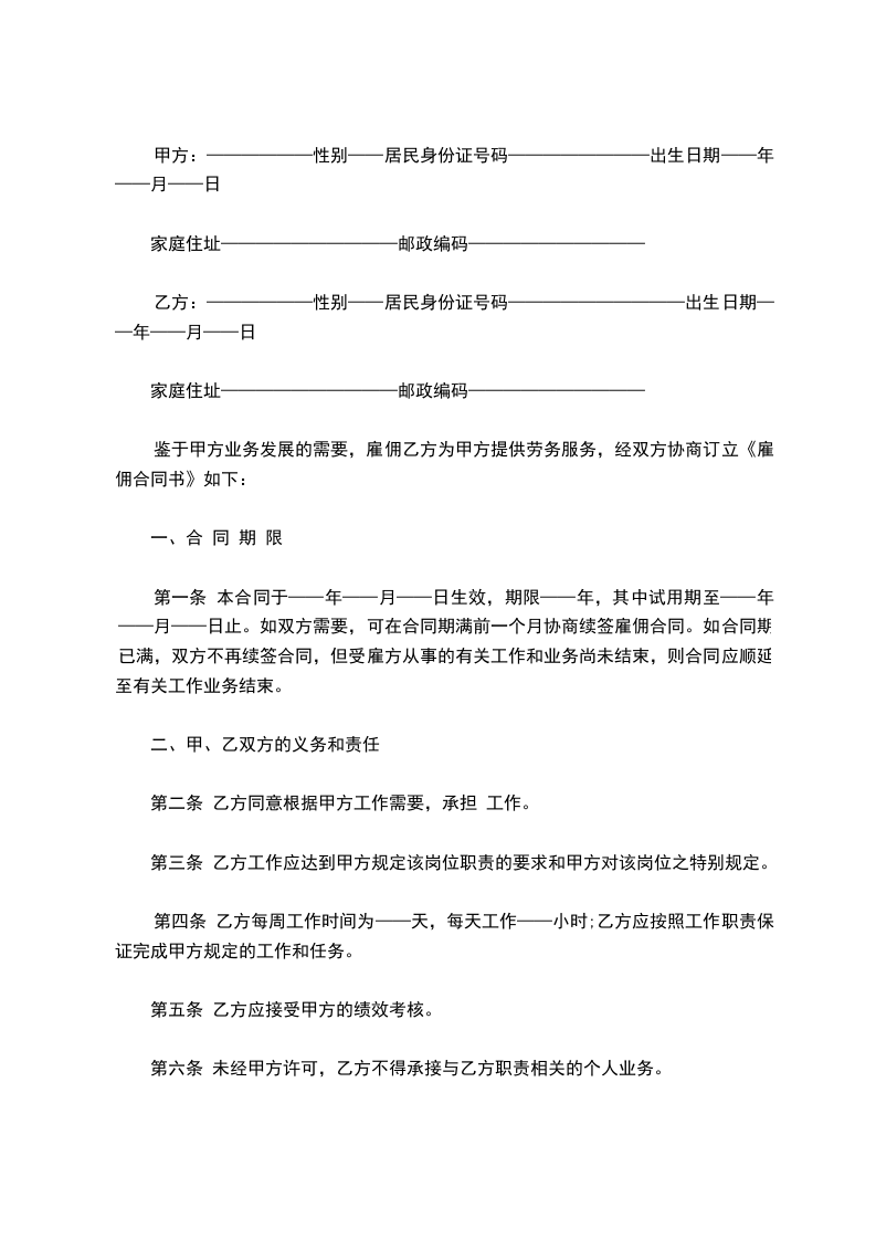 鉴于甲方业务发展的需要,雇佣乙方为甲方提供劳务服务,经双方协商订立《雇佣合同书》如下: