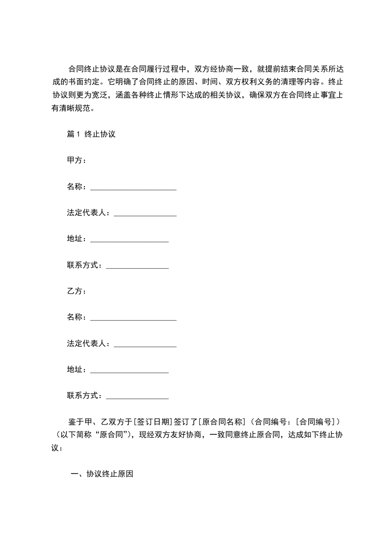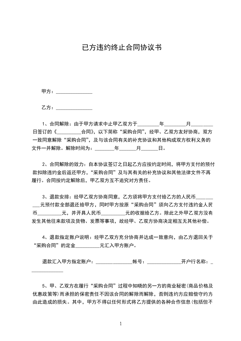 鉴于甲乙双方于[原合同签订日期]签订了[原合同名称](以下简称“原合同”),现因[违约方及违约事由],导致原合同无法继续履行。经双方友好协商,就原合同的终止事宜达成如下协议:
