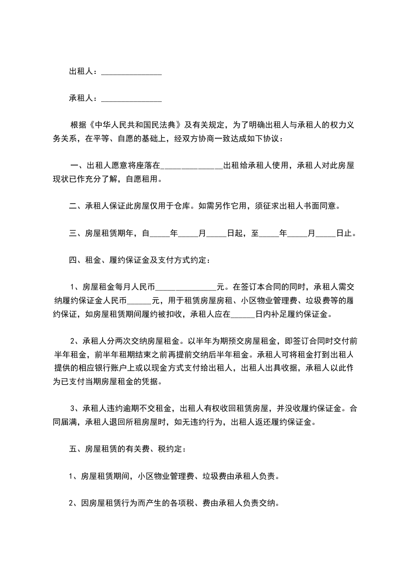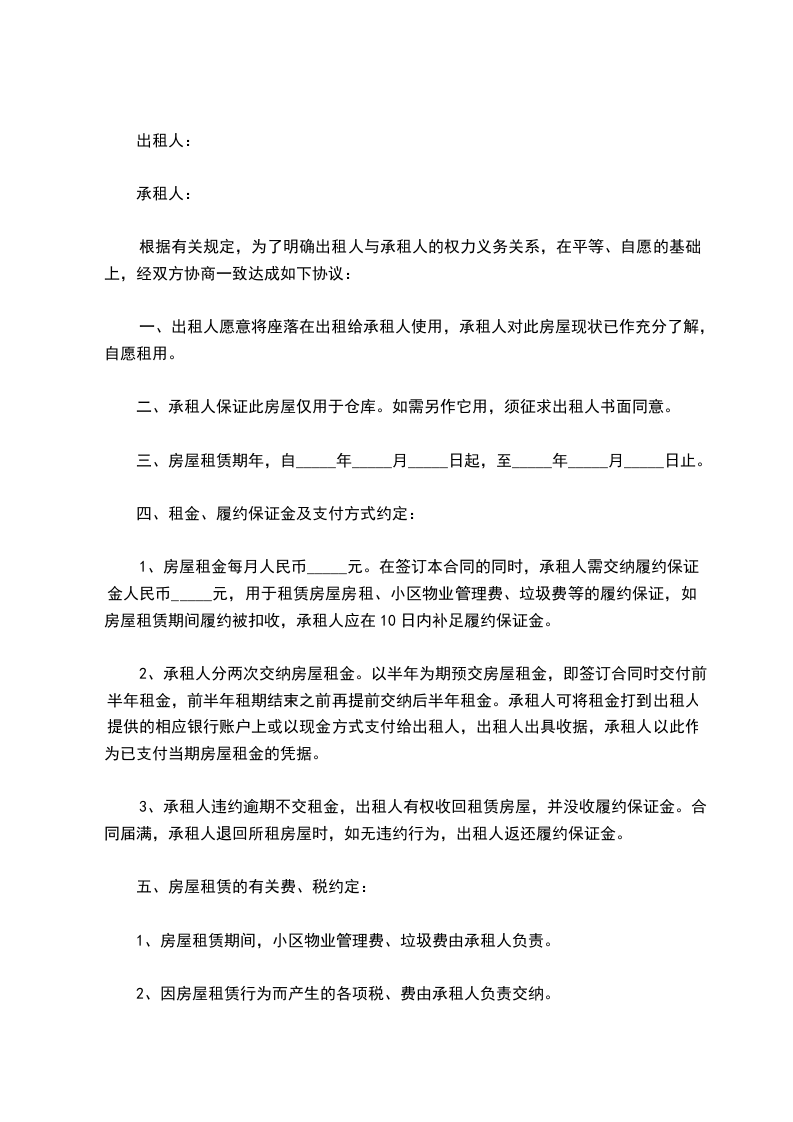 二、承租人保证此房屋仅用于仓库。如需另作它用,须征求出租人书面同意。