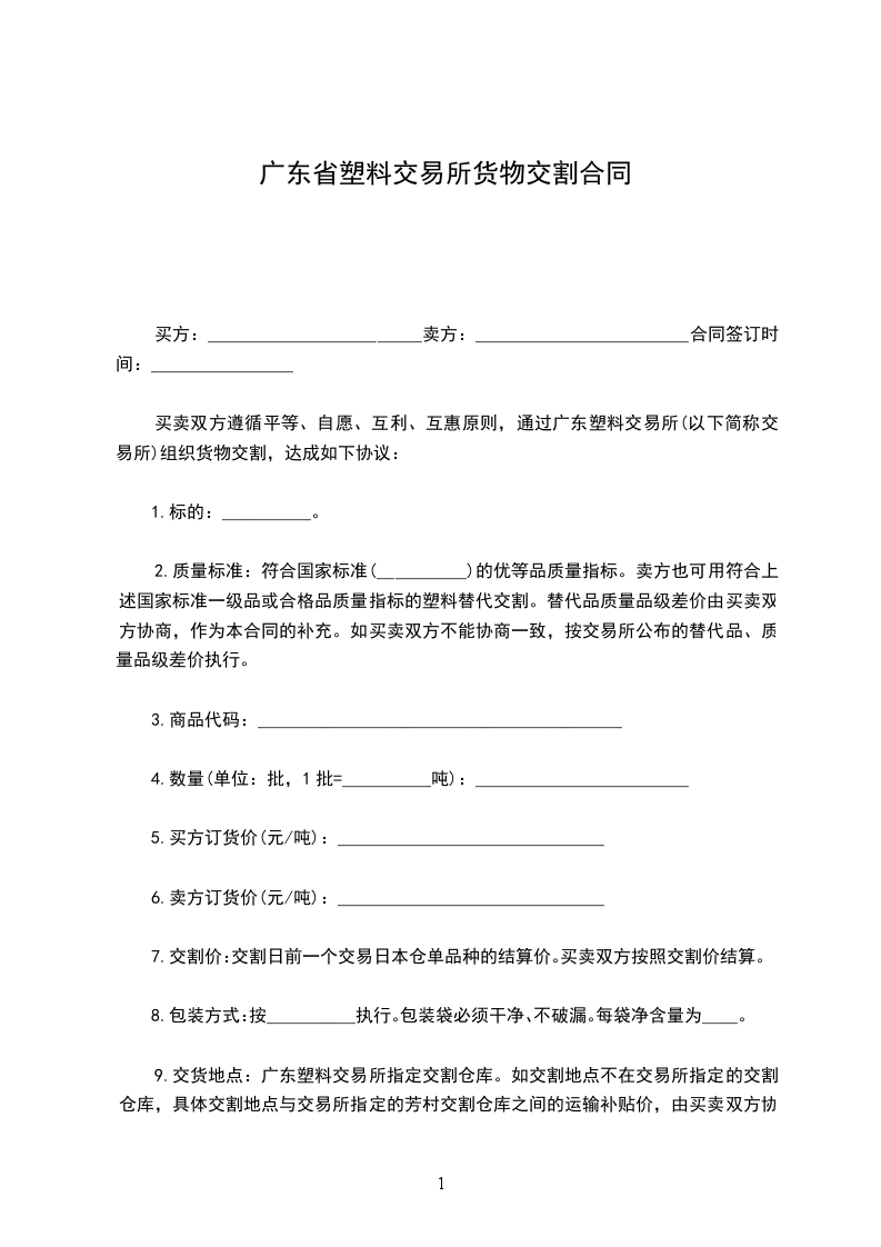 9.交货地点:广东塑料交易所指定交割仓库。如交割地点不在交易所指定的交割仓库,具体交割地点与交易所指定的芳村交割仓库之间的运输补贴价,由买卖双方协商,作为本合同的补充。如买卖双方不能协商一致,按交易所公布的运输补贴价标准执行。