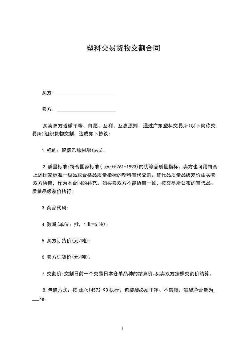 2.质量标准:符合国家标准(__________)的优等品质量指标。卖方也可用符合上述国家标准一级品或合格品质量指标的塑料替代交割。替代品质量品级差价由买卖双方协商,作为本合同的补充。如买卖双方不能协商一致,按交易所公布的替代品、质量品级差价执行。