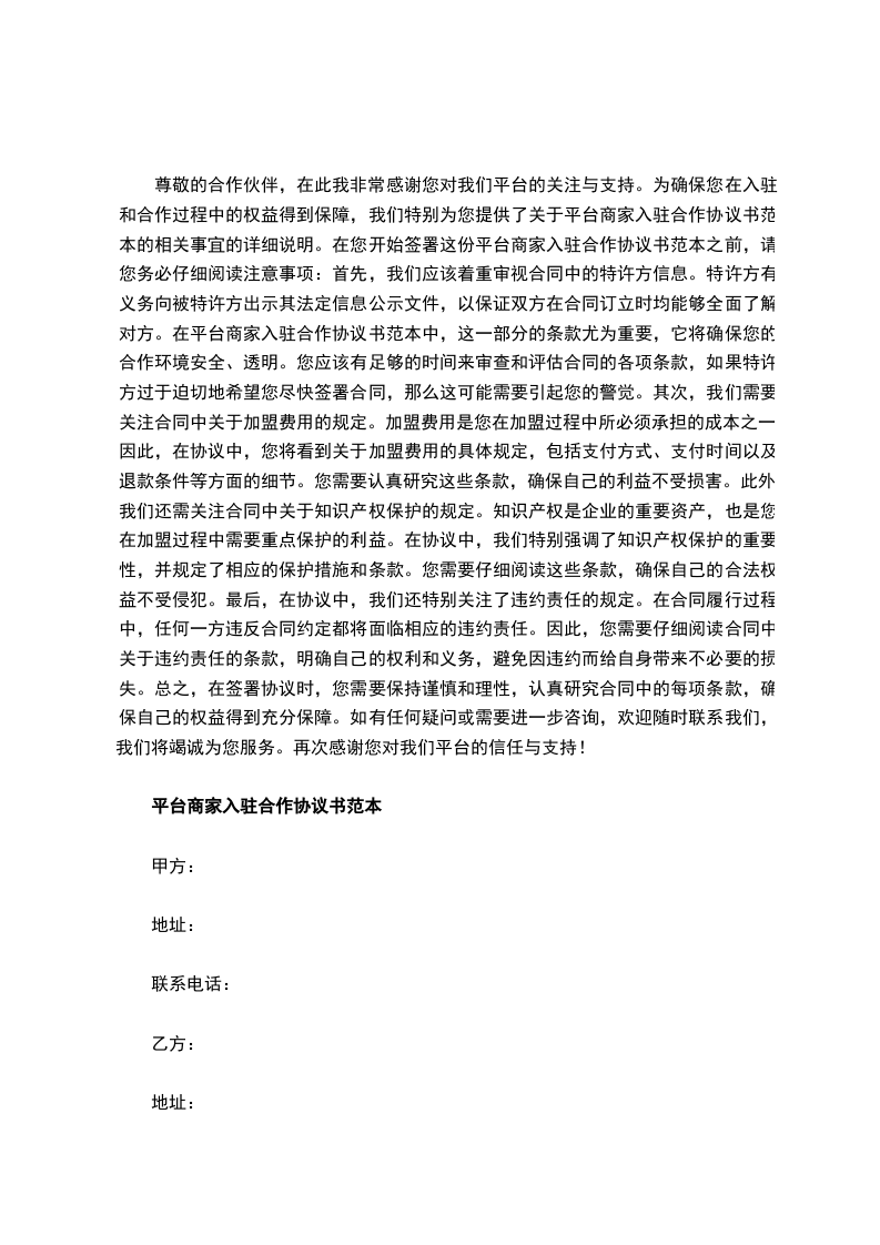 鉴于甲方拥有[平台名称](以下简称“平台”),为商家提供网络交易服务;乙方希望入驻平台开展经营活动,经双方友好协商,依据《中华人民共和国民法典》等相关法律法规的规定,就乙方入驻甲方平台事宜达成如下协议: