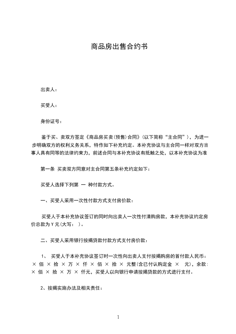 1、 买受人于本补充协议签订时一次性向出卖人支付按揭购房的首付款人民币: × 佰 × 拾 × 万 × 仟 × 佰 × 拾 × 元整(含已付认购定金 × 元),余款: × 佰 × 拾 × 万 × 仟元,买受人以向银行申请按揭贷款的方式进行支付。