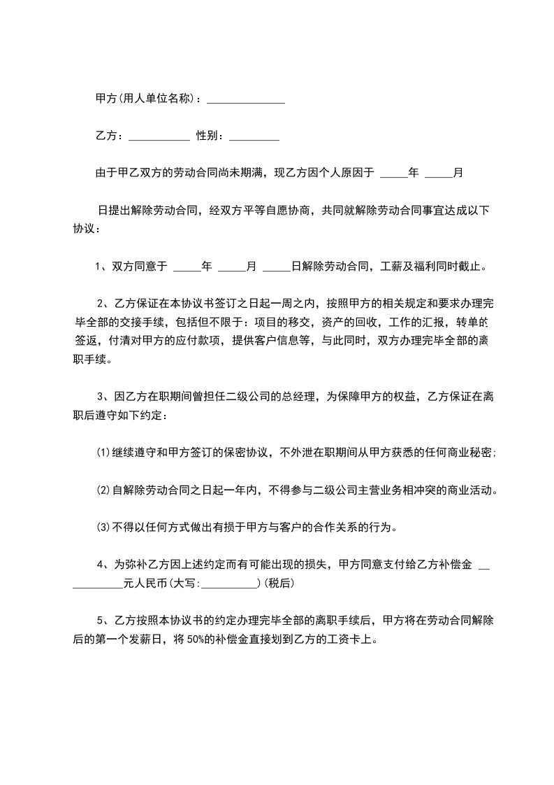 双方一致同意,劳动合同于____年__月__日正式解除。