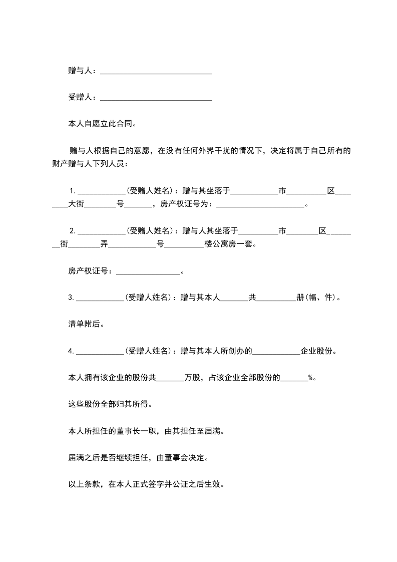 - (详细说明赠与的具体内容,如金钱、财物、房产份额等)例如:甲方同意赠与乙方人民币[X]元,该款项应在本协议生效后[X]个工作日内支付至乙方指定银行账户。