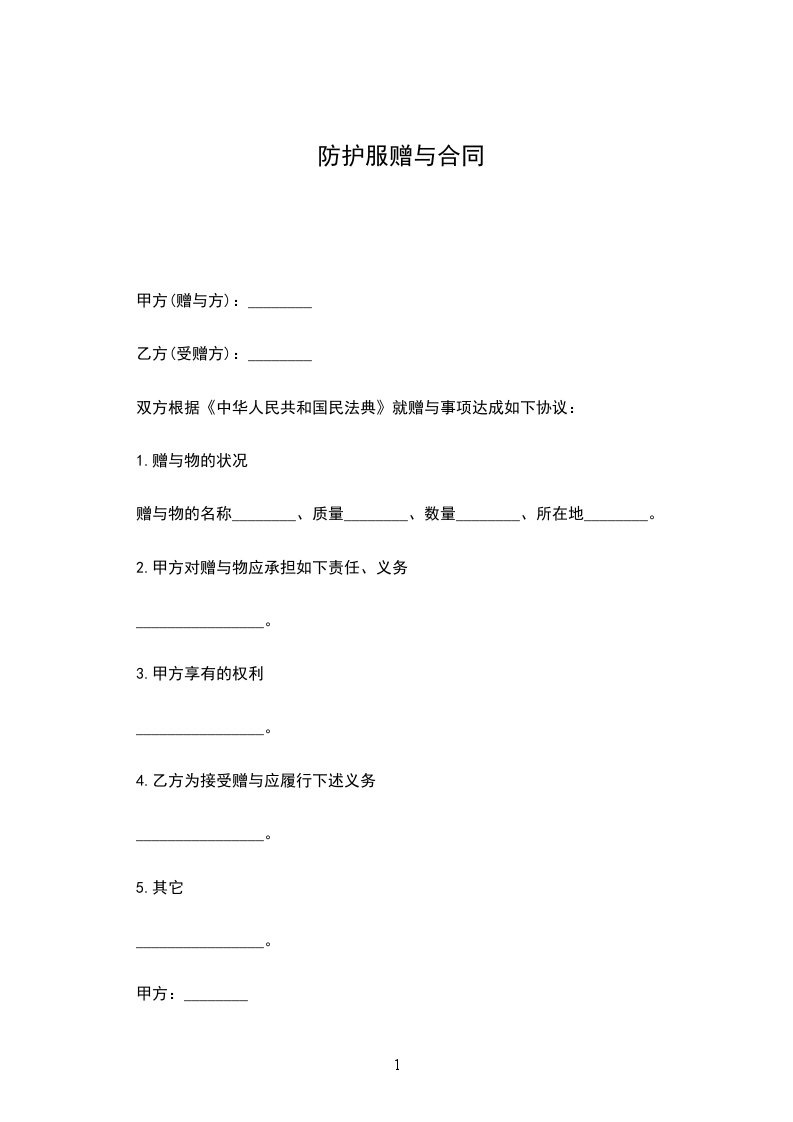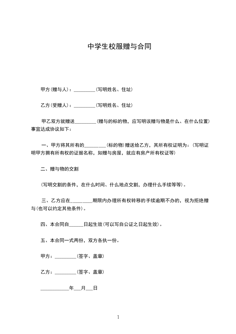 一、甲方将其所有的_________(标的物)赠送给乙方,其所有权证明为:(写明证明甲方拥有所有权的证据名称,如赠与房屋,就应有房产所有权证等)