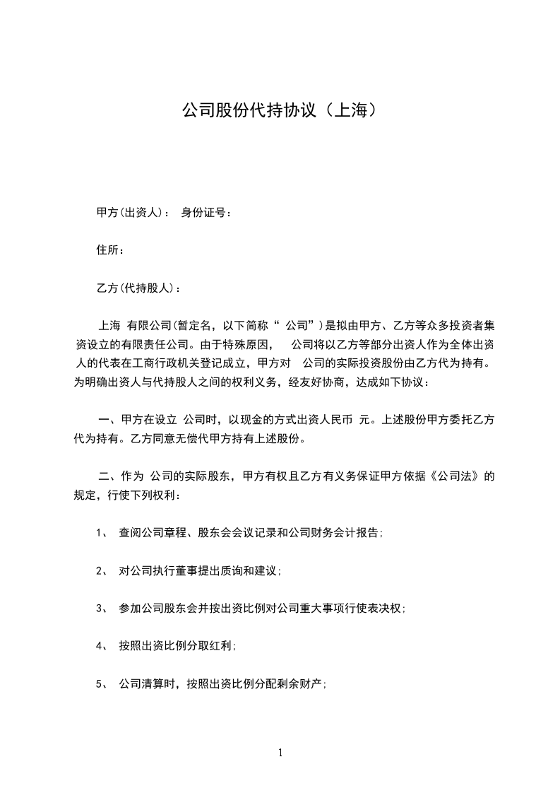 上海 有限公司(暂定名,以下简称“ 公司”)是拟由甲方、乙方等众多投资者集资设立的有限责任公司。由于特殊原因, 公司将以乙方等部分出资人作为全体出资人的代表在工商行政机关登记成立,甲方对 公司的实际投资股份由乙方代为持有。为明确出资人与代持股人之间的权利义务,经友好协商,达成如下协议: