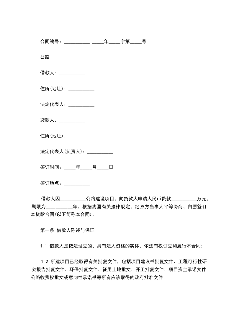 借款人因___________公路建设项目,向贷款人申请人民币贷款___________万元,期限为___________年。根据我国有关法律规定,经双方当事人平等协商,自愿签订本贷款合同(以下简称本合同)。