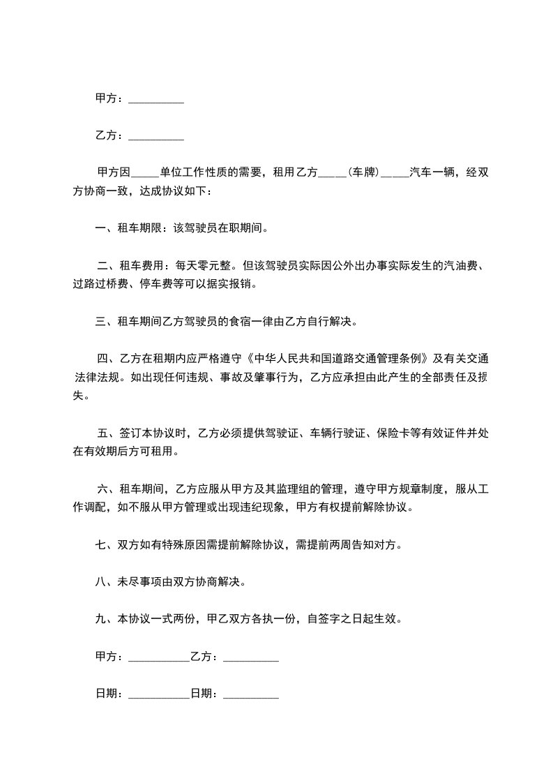 二、租车费用:每天零元整。但该驾驶员实际因公外出办事实际发生的汽油费、过路过桥费、停车费等可以据实报销。