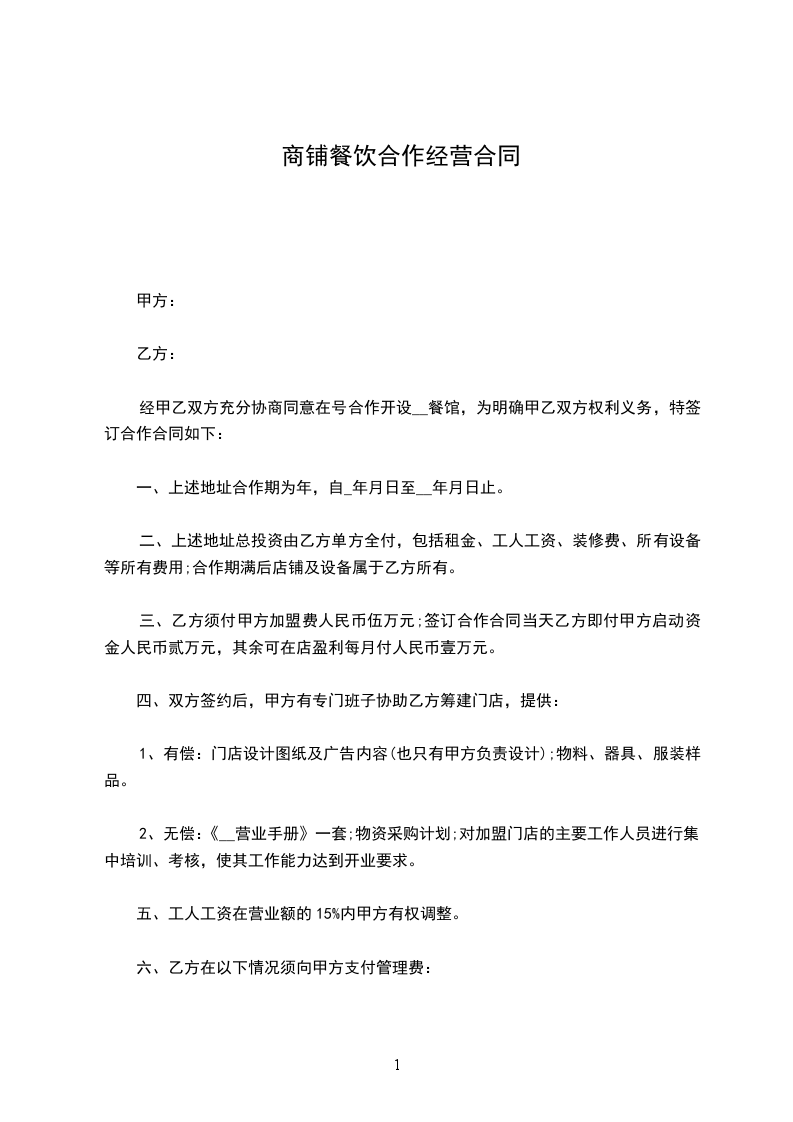 经甲乙双方充分协商同意在号合作开设__餐馆,为明确甲乙双方权利义务,特签订合作合同如下: