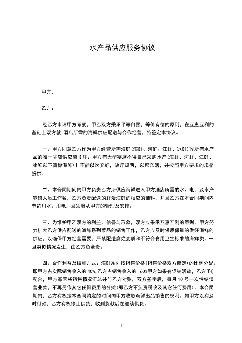 一、甲方同意乙方作为甲方经营所需海鲜(海鲜、河鲜、江鲜、冰鲜)等所有水产品的唯一驻店供应商【注:甲方有大型宴席不得自己采购水产(海鲜、河鲜、江鲜、冰鲜以下简称海鲜)】不能以次充好,缺斤短两,以死充活,并按照甲方要求的规格提供。