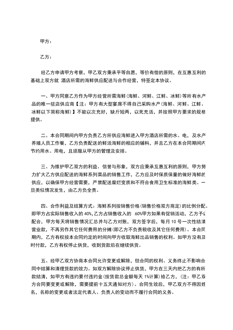 经乙方申请甲方考察,甲乙双方秉承平等自愿,等价有偿的原则,在互惠互利的基础上双方就 酒店所需的海鲜供应配送与合作经营,特签定本协议。