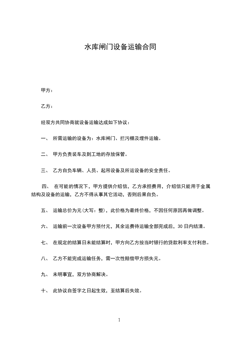 六、 运输前一次设备甲方预付元,其余运费待运输全部完成后,30日内结清。