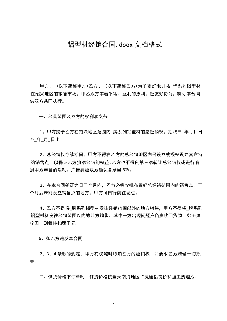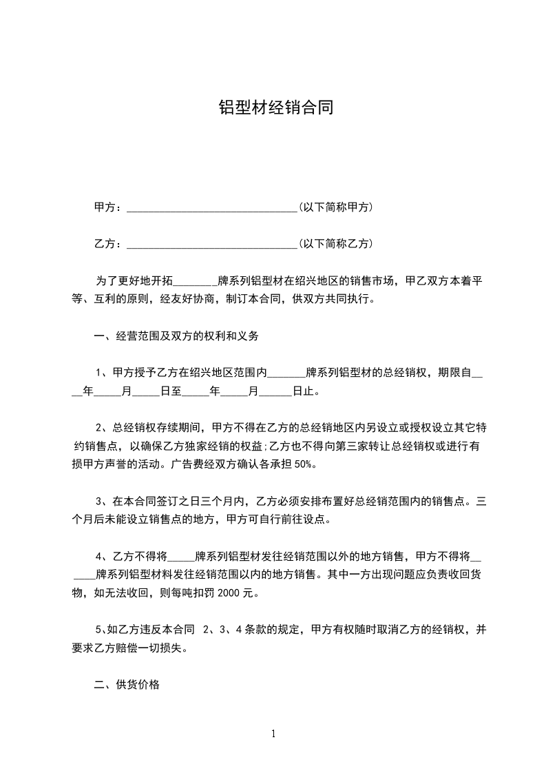 1、甲方授予乙方在绍兴地区范围内_______牌系列铝型材的总经销权,期限自____年_____月_____日至_____年_____月______日止。