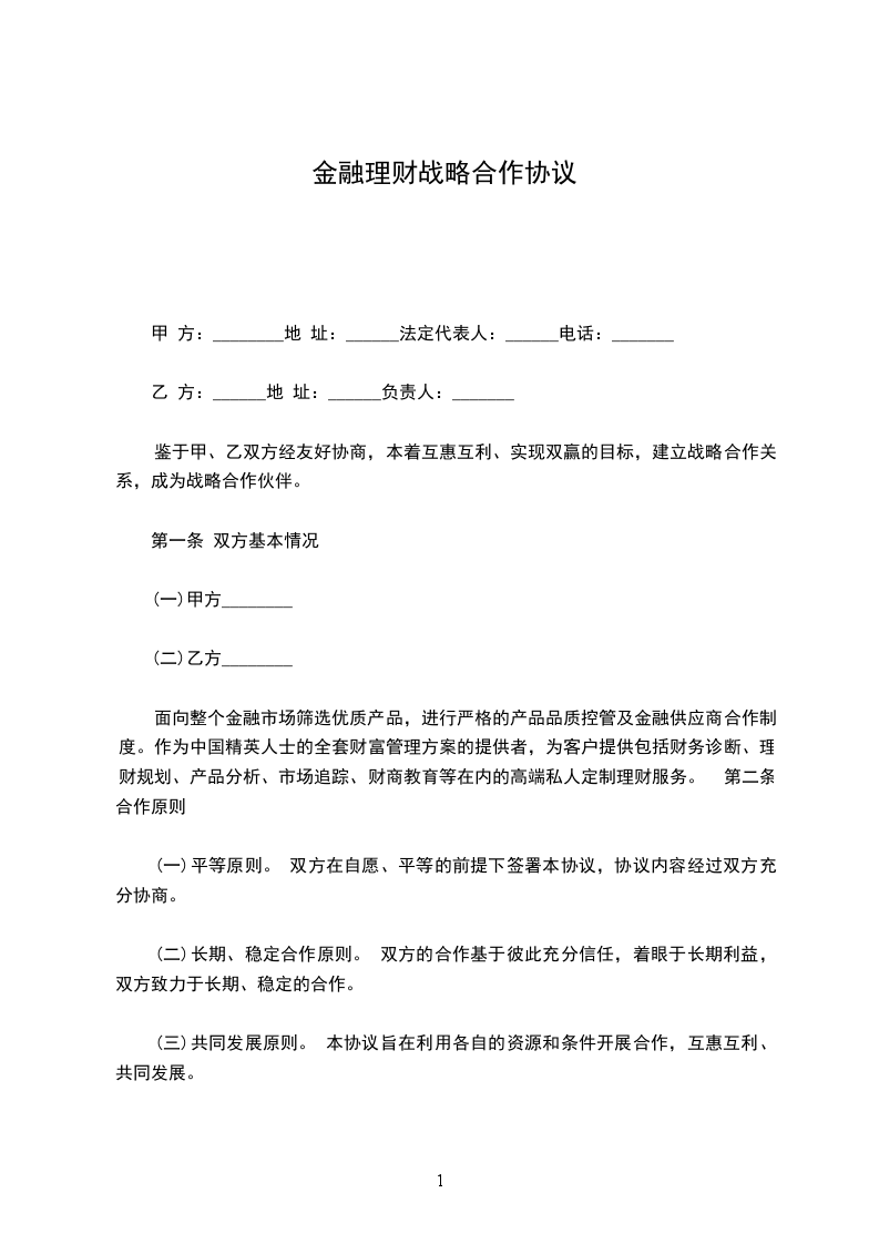 第一条 双方建立战略合作关系,旨在于为乙方会员企业搭建融资平台,促进企业、金融机构和区域经济可持续发展。