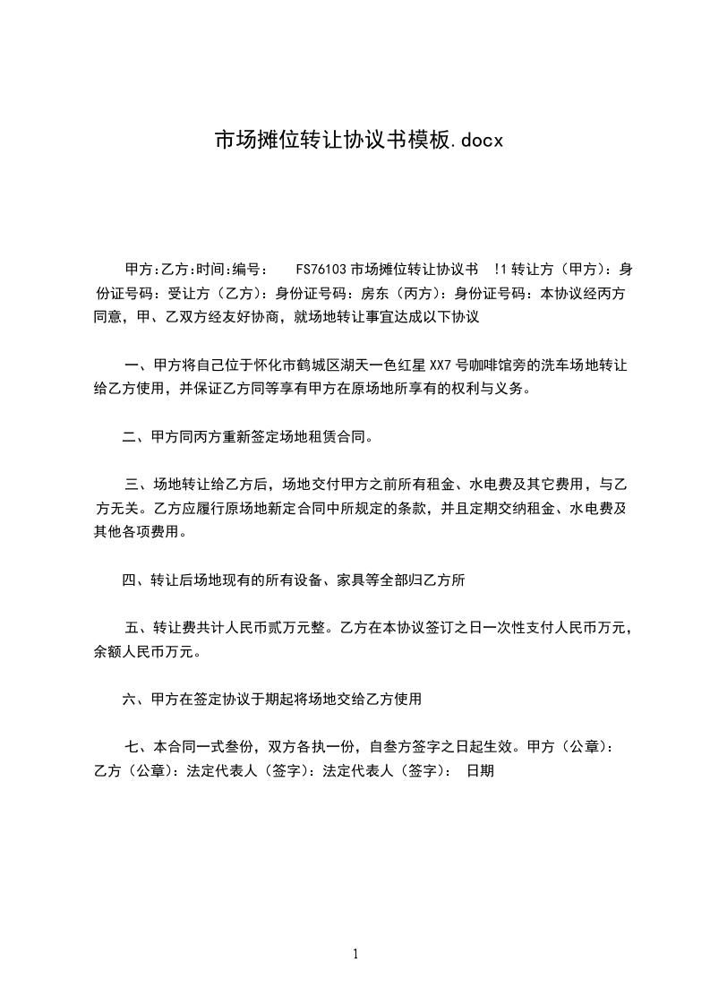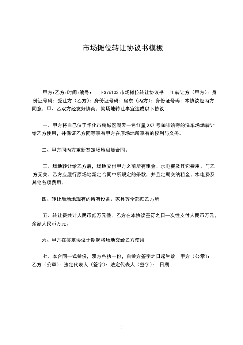 1. 甲方转让给乙方的摊位位于__________________(具体地址),摊位面积为______平方米。