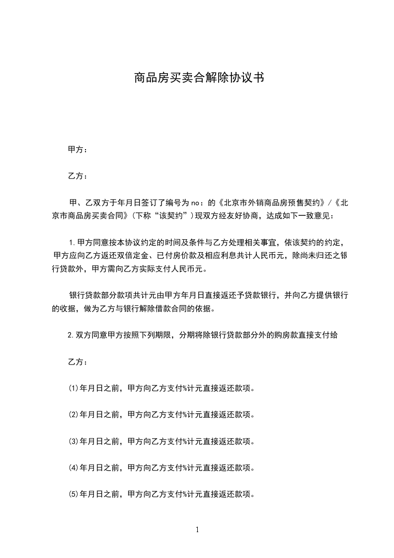 1.甲方同意按本协议约定的时间及条件与乙方处理相关事宜,依该契约的约定,甲方应向乙方返还双倍定金、已付房价款及相应利息共计人民币_____元,除尚未归还之银行贷款外,甲方需向乙方实际支付人民币_____元。